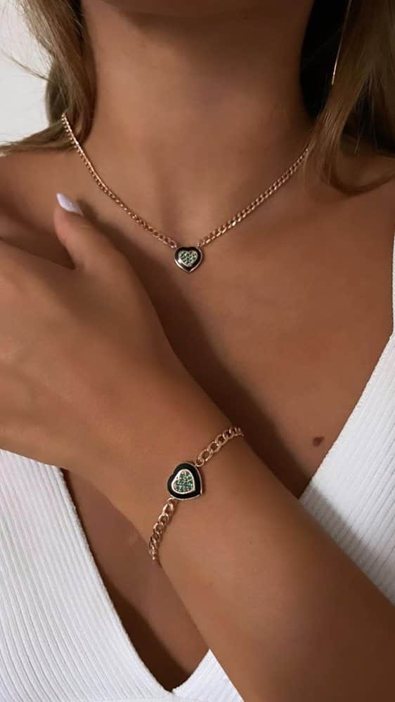 צמיד חוליות לב אמייל שחור ואמרלד מעבדה